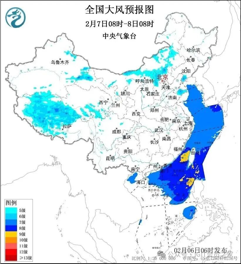 预计,2月6日8时至7日8时,新疆北疆、青海东部和南部、西藏中北部、内蒙古东部、辽东半岛、山东半岛、江苏西北部和东部沿海、安徽东部和南部等地部分地区有5至6级风,阵风7至8级。黄海中东部海域、东海大部海域、台湾海峡、台湾以东洋面、南海东北部将有7至8级、阵风9级的大风。