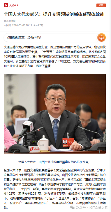 全国人大代表、山西交通控股集团董事长武艺结合企业实践与行业观察,分享了该集团以科技创新引领产业创新的具体成效。山西交控始终将科技创新摆在核心位置,研发投入强度连续8年保持行业优秀水平,主持完成的“重载水泥混凝土铺面关键技术与工程应用”项目斩获国家科学技术进步二等奖,成为行业技术创新的标杆。“十四五”期间,集团创新成果持续涌现,累计获得省部级科学技术奖102项,取得专利2051项,发布标准175项;省部级科技创新平台增至33个,成功培育国家级专精特新“小巨人”企业1户、省级“专精特新”“小巨人”企业19户、高新技术企业32户,构建起梯次分明、布局合理的创新主体矩阵。