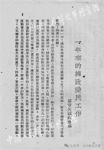 人民军队来自人民,服务于人民,自诞生之日起,便将“拥政爱民”融入血脉。1944年3月,八路军留守兵团政治部编印的《一年来的拥政爱民工作》,如今珍藏在解放军档案馆。这份文件用近2万字对部队拥政爱民工作进行细致分析,让我们看到了当年部队对群众工作的高度重视和其背后的良苦用心。