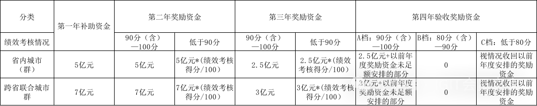 (一)分配方法。对纳入年度支持范围的城市(群),财政部根据交通运输部建议,结合财力情况,采取“奖补结合”方式,专门安排一定规模的交通运输领域重点项目资金(以下简称奖补资金)予以支持,并加强对中央财政补助地方的公路建设等其他相关项目资金、中央企业资金的统筹协调。奖补资金按照交通运输部核定投资额的一定比例安排,东部地区(北京市、天津市、大连市、上海市、江苏省、浙江省、宁波市、福建省、厦门市、山东省、青岛市、广东省、深圳市)、中部地区(河北省、山西省、辽宁省、吉林省、黑龙江省、安徽省、江西省、河南省、湖北省、湖南省、海南省)、西部地区(内蒙古自治区、广西壮族自治区、重庆市、四川省、贵州省、云南省、西藏自治区、陕西省、甘肃省、青海省、宁夏回族自治区、新疆维吾尔自治区、新疆生产建设兵团)奖补比例分别为40%、50%、60%,实施第一年按每个省内城市(群)5亿元的上限标准予以补助(跨省联合城市群补助总额按7亿元上限控制),用于启动相关工作。后续年度根据绩效评价结果予以奖励。总体奖补资金按照每个城市、省内联合申报城市群原则上不超过15亿元、每个跨省联合申报城市群原则上不超过20亿元控制。