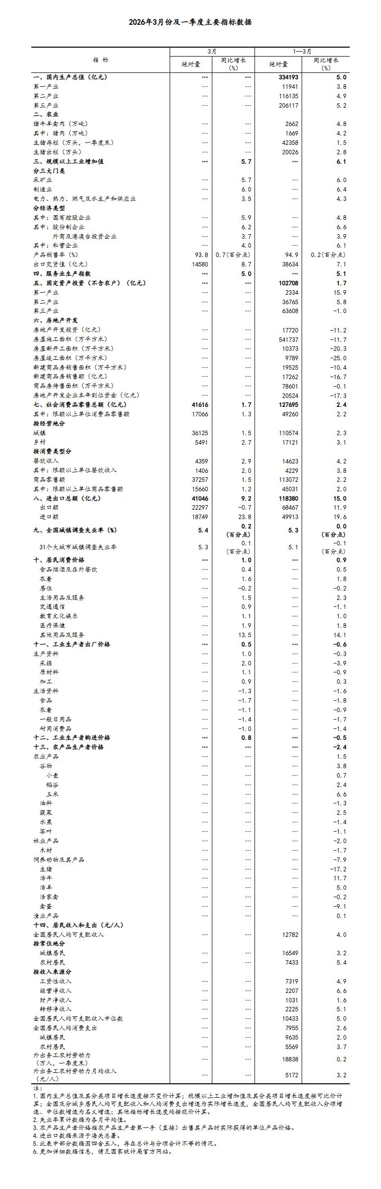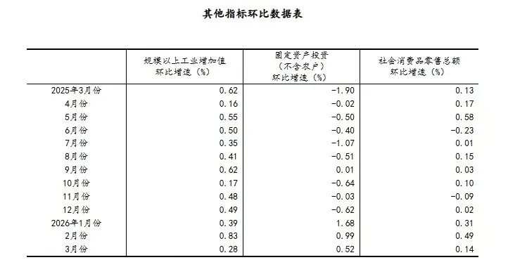 (2)根据季节调整模型自动修正结果,对近一年来各期国内生产总值、规模以上工业增加值、固定资产投资(不含农户)、社会消费品零售总额环比增速进行修订。修订结果及2026年一季度GDP环比数据、2026年3月份其他指标环比数据如下: