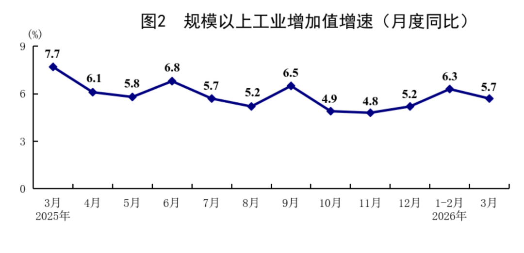 一季度,全国规模以上工业增加值同比增长6.1%,比上年四季度加快1.1个百分点。分三大门类看,采矿业增加值同比增长6.0%,制造业增长6.4%,电力、热力、燃气及水生产和供应业增长4.3%。装备制造业增加值同比增长8.9%,高技术制造业增加值增长12.5%,分别快于全部规模以上工业增加值2.8和6.4个百分点。分经济类型看,国有控股企业增加值同比增长4.8%;股份制企业增长6.6%,外商及港澳台投资企业增长3.9%;私营企业增长6.1%。分产品看,3D打印设备、锂离子电池、工业机器人产品产量同比分别增长54.0%、40.8%、33.2%。3月份,规模以上工业增加值同比增长5.7%,环比增长0.28%。3月份,制造业采购经理指数为50.4%,比上月上升1.4个百分点;企业生产经营活动预期指数为53.4%。1—2月份,全国规模以上工业企业实现利润总额10246亿元,同比增长15.2%。