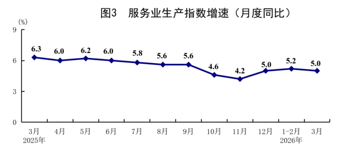 一季度,服务业增加值同比增长5.2%。其中,租赁和商务服务业,信息传输、软件和信息技术服务业,金融业,交通运输、仓储和邮政业,住宿和餐饮业增加值分别增长12.2%、10.6%、6.5%、4.3%、4.3%。3月份,全国服务业生产指数同比增长5.0%。其中,信息传输、软件和信息技术服务业,租赁和商务服务业,金融业生产指数分别增长11.8%、10.1%、6.7%。1—2月份,规模以上服务业企业营业收入同比增长7.4%。3月份,服务业商务活动指数为50.2%,比上月上升0.5个百分点;服务业业务活动预期指数为54.8%。其中,铁路运输、电信广播电视及卫星传输服务、货币金融服务、保险等行业商务活动指数位于55.0%以上较高景气区间。