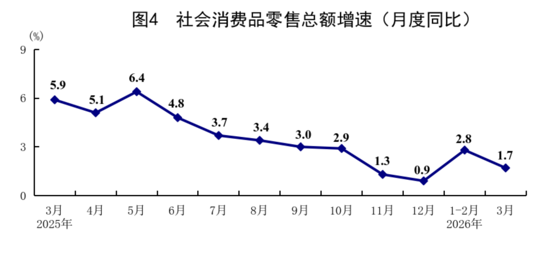 一季度,社会消费品零售总额127695亿元,同比增长2.4%,比上年四季度加快0.7个百分点。按经营单位所在地分,城镇消费品零售额110574亿元,同比增长2.3%;乡村消费品零售额17121亿元,增长3.1%。按消费类型分,商品零售额113072亿元,增长2.2%;餐饮收入14623亿元,增长4.2%。基本生活类和部分升级类商品销售增长较快,限额以上单位粮油食品类、服装鞋帽针纺织品类、通讯器材类、金银珠宝类商品零售额同比分别增长10.0%、9.3%、20.8%、12.6%。3月份,社会消费品零售总额同比增长1.7%,环比增长0.14%。一季度,服务零售额同比增长5.5%,增速与上年全年持平。其中,通讯信息服务类、旅游咨询租赁服务类、文体休闲服务类零售额较快增长。一季度,全国网上商品和服务零售额49774亿元,同比增长8.0%。其中,网上商品零售额31614亿元,增长7.5%,占社会消费品零售总额的比重为24.8%;网上服务零售额18160亿元,增长8.8%。