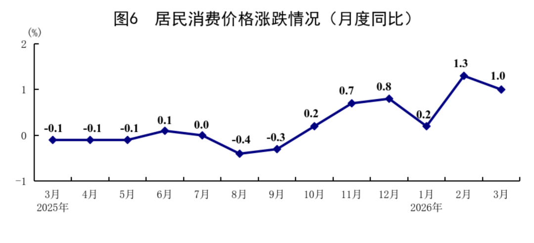 一季度,全国居民消费价格(CPI)同比上涨0.9%,涨幅比上年四季度扩大0.4个百分点。分类别看,食品烟酒及在外餐饮价格同比上涨0.5%,衣着价格上涨1.8%,居住价格下降0.2%,生活用品及服务价格上涨2.3%,交通通信价格下降1.1%,教育文化娱乐价格上涨1.0%,医疗保健价格上涨1.8%,其他用品及服务价格上涨14.1%。在食品烟酒及在外餐饮价格中,猪肉价格下降11.3%,粮食价格下降0.3%,鲜果价格上涨4.3%,鲜菜价格上涨7.6%。扣除食品和能源价格后的核心CPI同比上涨1.2%。3月份,全国居民消费价格同比上涨1.0%,环比下降0.7%。