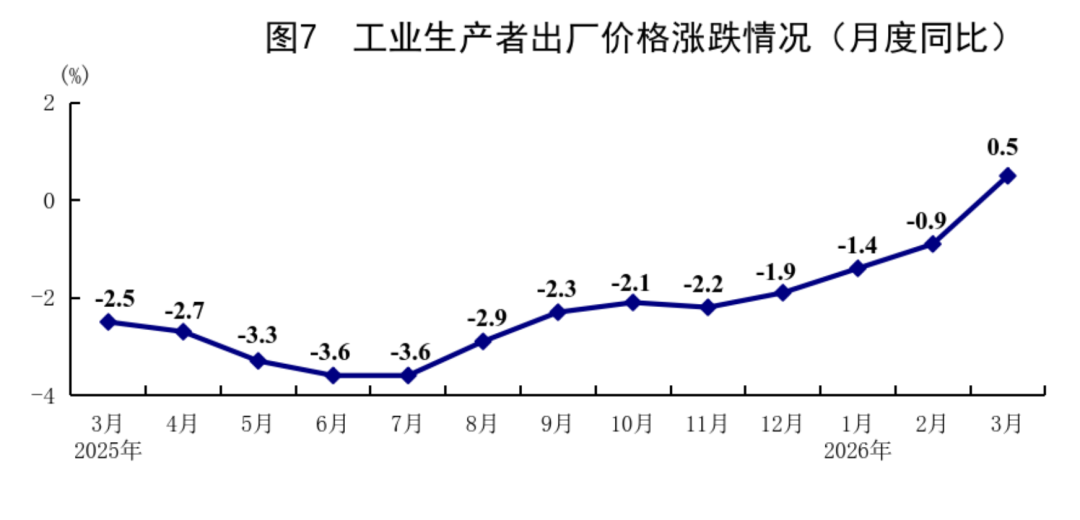 一季度,全国工业生产者出厂价格同比下降0.6%,降幅比上年四季度收窄1.5个百分点。其中,3月份同比上涨0.5%,上月为下降0.9%;环比上涨1.0%。一季度,全国工业生产者购进价格同比下降0.5%。其中,3月份同比上涨0.8%,上月为下降0.7%;环比上涨1.2%。