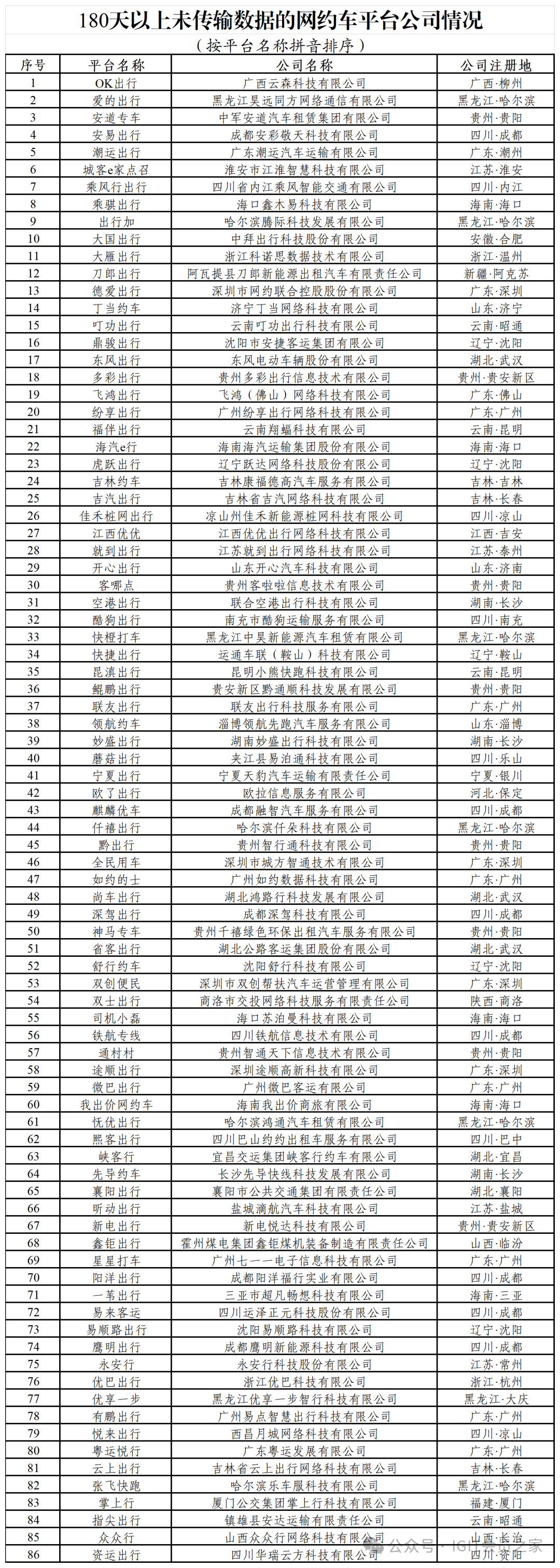 一、在订单量前10名的平台中,按订单合规率(指驾驶员和车辆均获得许可的订单量占比)从高到低分别是风韵出行、如祺出行、喜行约车、及时用车、T3出行、享道出行、阳光出行、曹操出行、滴滴出行、花小猪出行。订单合规率增长的主要网约车平台是T3出行、曹操出行、阳光出行。