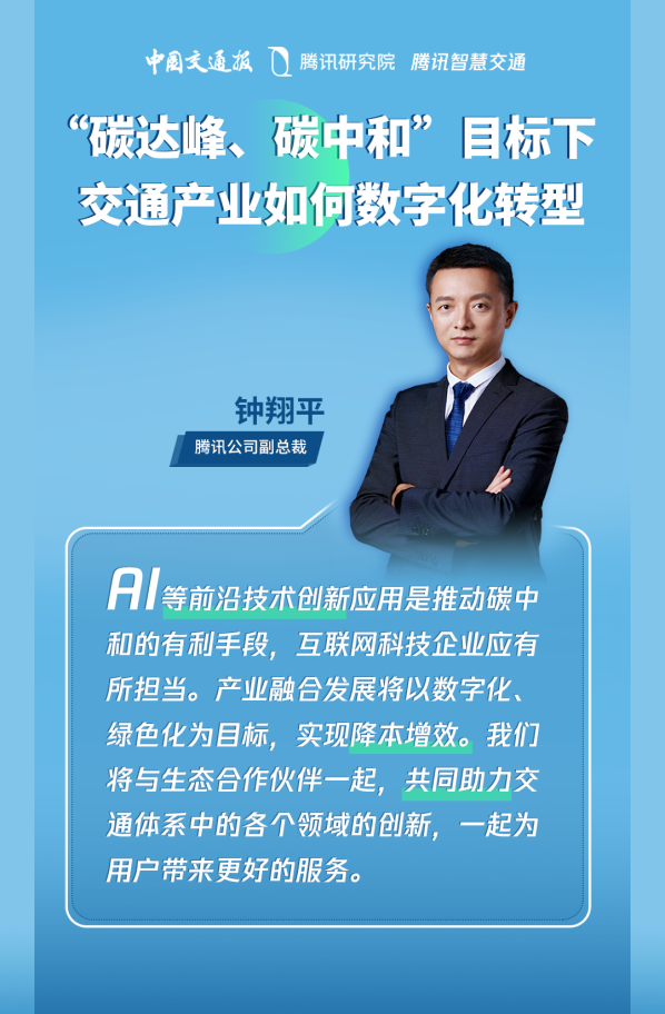 在碳中和的目标下,蕴藏着更多的发展机遇和挑战。科技创新需要不断畅想、跨界探索、研发和实践,通过不断创新为用户提供更好的服务,是互联网企业的新时代的责任、使命和担当。他还表示,腾讯希望和合作伙伴一起,助力交通体系的创新和升级,一起为用户带来更好的服务。