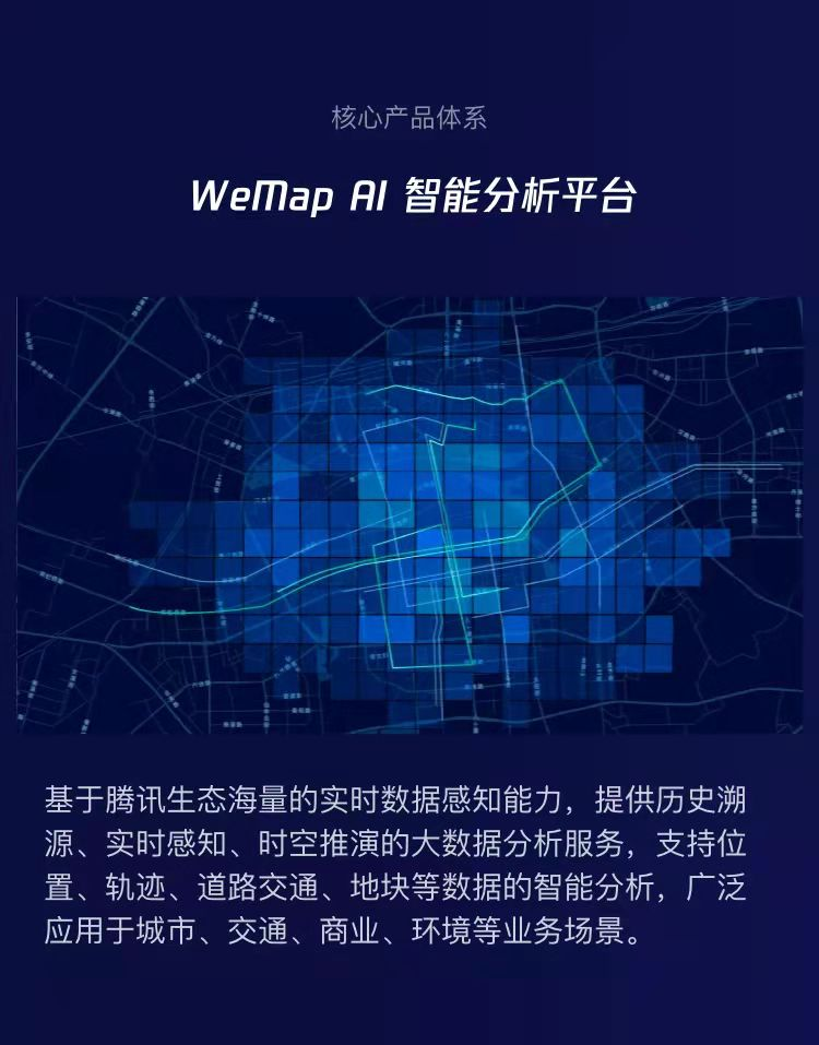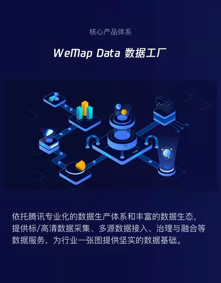 WeMap(腾讯地图产业版)是腾讯位置服务面向地图4.0-产业互联网时代所推出的数字地图底座。依托腾讯实时泛在的时空感知能力,腾讯智慧产业和合作伙伴携手建立行业生态,实现地图和真实世界的共生共建,达到“实时感知、全面刻画、精准决策和智能服务”,助力推进数字经济和智慧社会的建设。