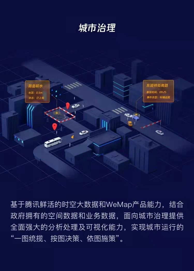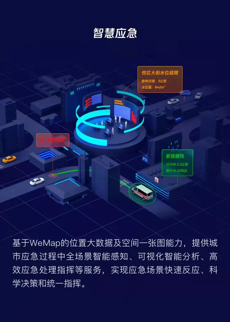 基于WeMap的位置大数据及空间一张图能力,提供城市应急过程中全场景智能感知、可视化智能分析、高效应急处理指挥等服务,实现应急场景快速反应、科学决策和统一指挥。