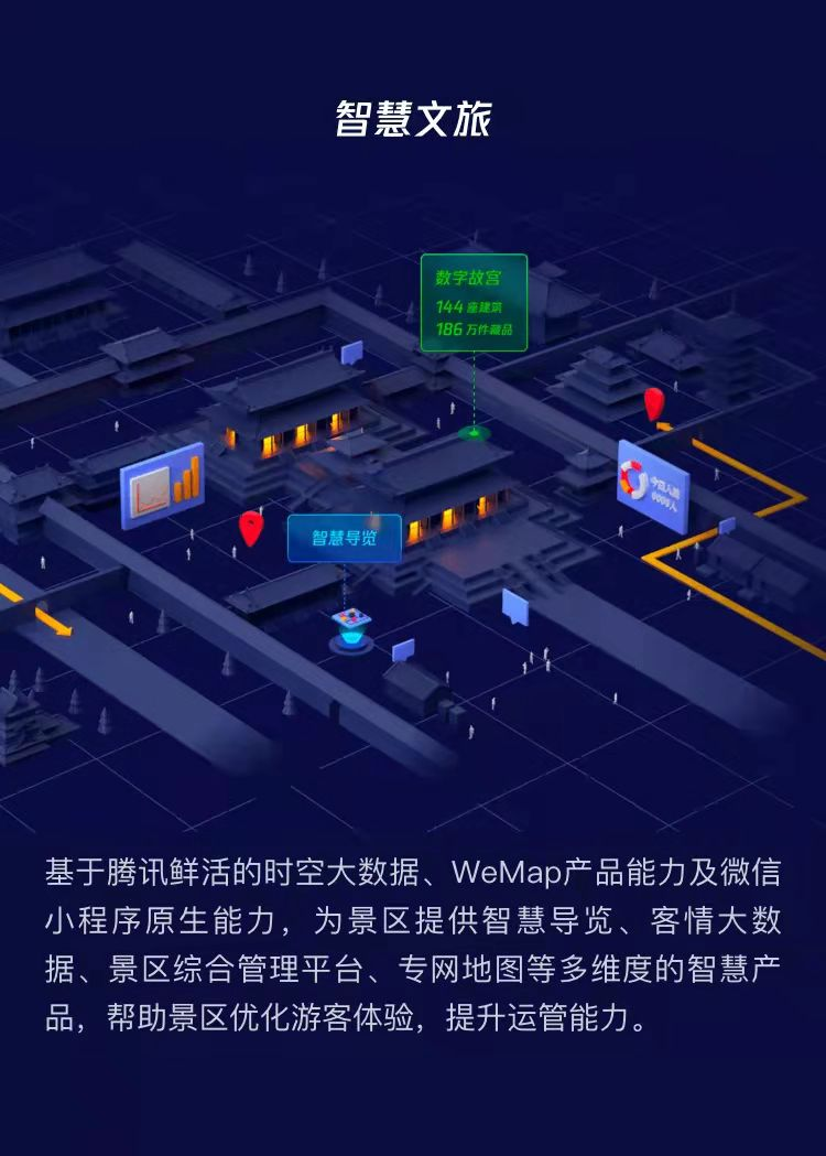 基于腾讯鲜活的时空大数据、WeMap产品能力及微信小程序原生能力,为景区提供智慧导览、位置大数据、专网地图等多维度的智慧产品,帮助景区优化游客体验,提升运管能力。