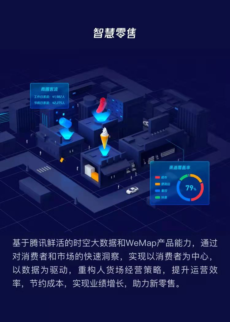 基于腾讯鲜活的时空大数据和WeMap产品能力,通过对消费者和市场的快速洞察,实现以消费者为中心,以数据为驱动,重构人货场经营策略,提升运营效率,节约成本,实现业绩增长,助力新零售。