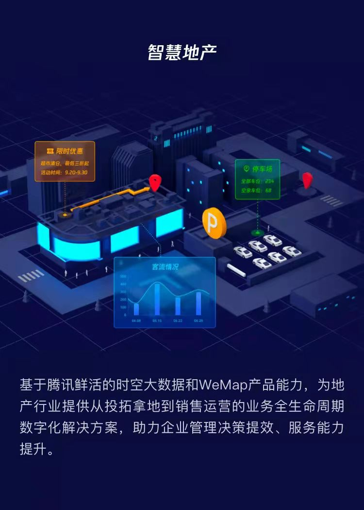 基于腾讯鲜活的时空大数据和WeMap产品能力,为地产行业提供从投拓拿地到销售运营的业务全生命周期数字化解决方案,助力企业管理决策提效、服务能力提升。