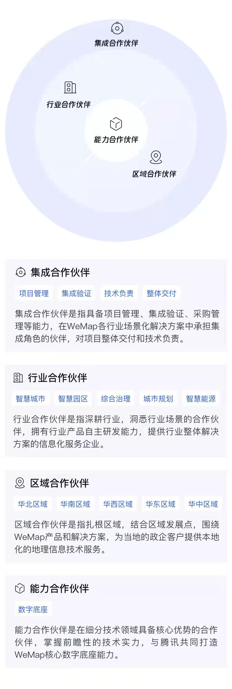 WeMap生态合作伙伴计划是腾讯地图⾯向智慧产业⽅向的合作伙伴⻓期合作计划,联合能力合作伙伴共建地图数字基础,⾯向全社会招募⾏业、区域、集成合作⽅向的伙伴。
