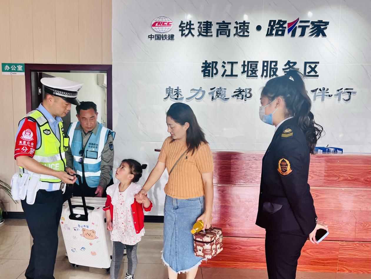 原来,5月1日上午10时左右,铁建高速四川德都项目都江堰服务区广场内一位年轻妈妈带着一名小女孩找到了当班人员喻荣露,希望她能帮忙把她们送到就近的都江堰市区乘车。喻荣露见这位女士满眼泪光,便立即暂停了手头的工作,将她们引导至服务区社会治安办公室休息,并为她们送上纸巾和茶水、饮料,用热情和关爱化解了这位女士焦虑、难过的情绪。