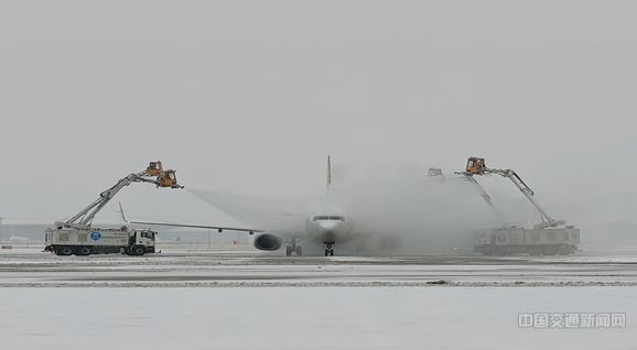 图为首都机场正在进行航空器除冰。