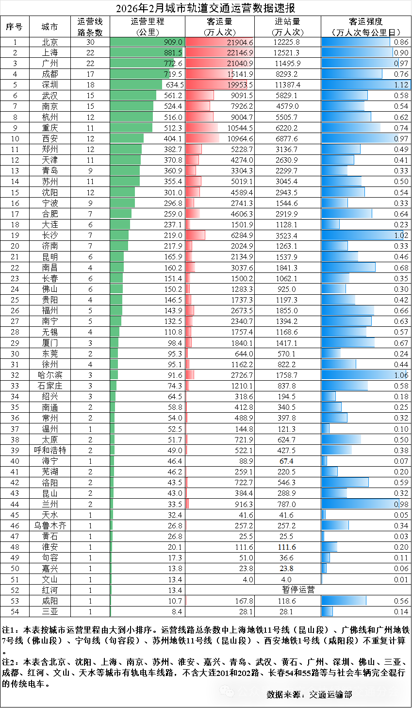 2026年2月城市轨道交通运营数据速报